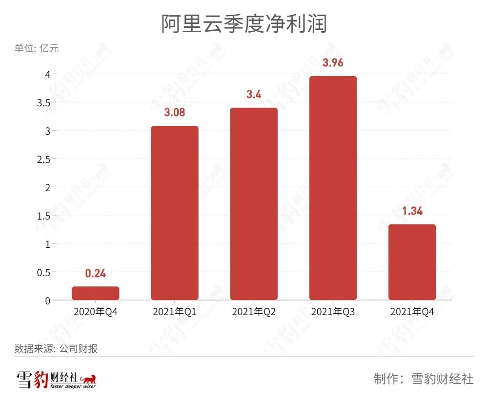 在利润方面,阿里云2021年Q4净利润环比骤降66.16%至1.34亿元,远低于前3个季度。