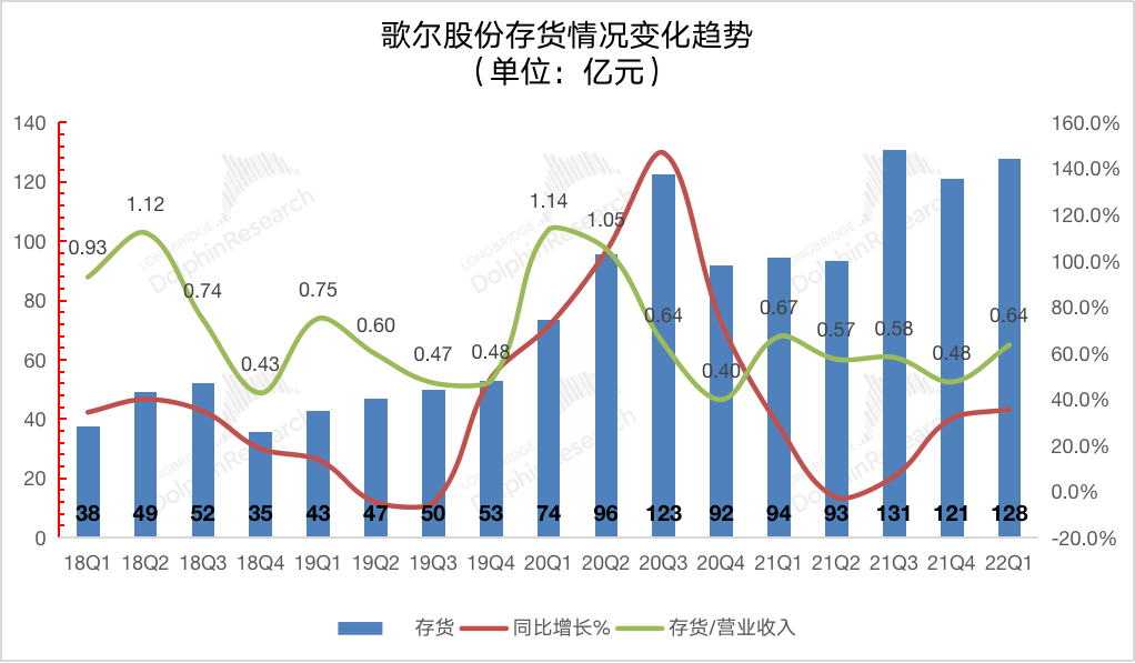 歌尔股份 2022 年第一季度存货128亿元,同比增长35.6%。从存货/营业收入指标看,歌尔股份本季度有所回升至0.64。歌尔股份存货占比在Q1会有季节性提升的情况,主要是由于Q1收入端相比于Q4旺季有所回落,从而在分母端影响存货占收入比值,从历史同期看,维持在合理水位。