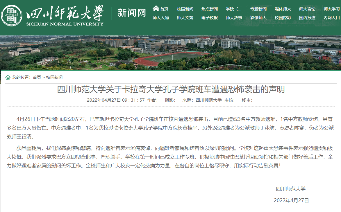 2022年4月27日,四川师范大学于官网发布《关于卡拉奇大学孔子学院班车遭遇恐怖袭击的声明》(简称《声明》)。