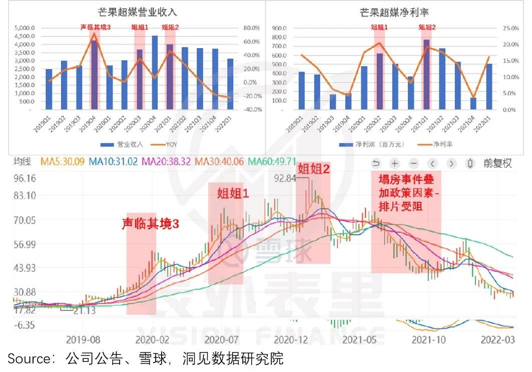 财务数据仍处于负增长,股价却逆势高涨,或许与财报中宣布的重点节目息息相关:《声生不息》《浪姐3》等重点综艺节目将于2022Q2上线。