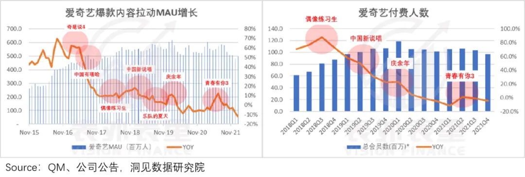 比如,爱奇艺每逢出现爆款,MAU就会大幅提振,订阅人数也会同比出现波峰。但爆款内容热度一落,付费率就会受影响。