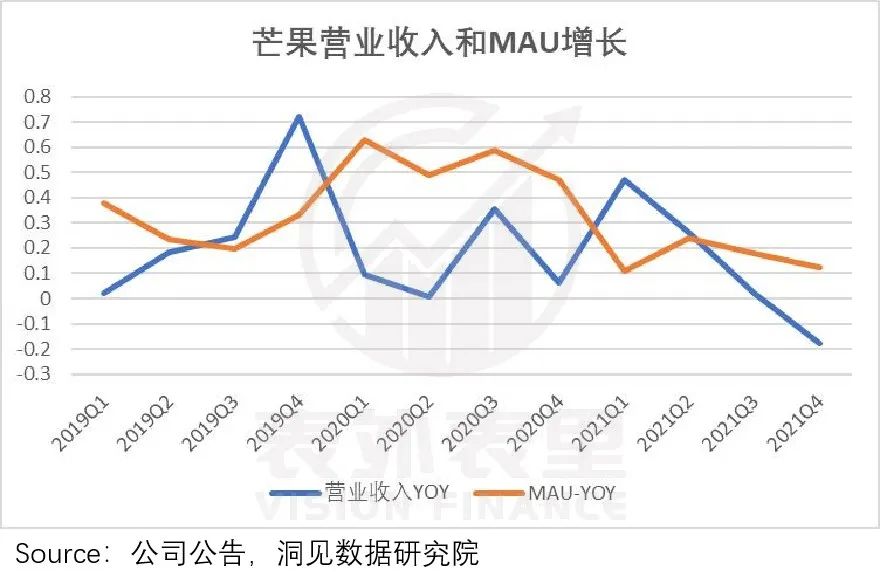 因此,即便内容不够好看,用户出走,短期内也不会迅速威胁到平台的收入。这在数据上就体现为MAU和营业收入增速的不完全同步。