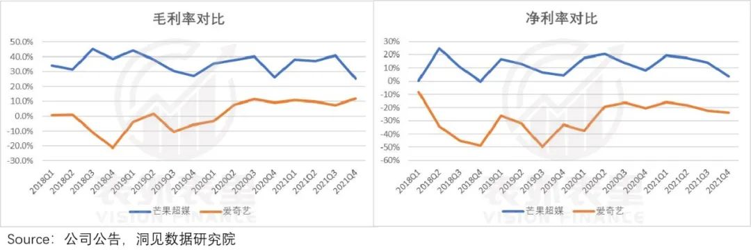 两相对比下,也使得芒果超媒在内容制作上,享有更低的成本,无论是毛利率,还是净利率,都常年高于国内长视频头号玩家-爱奇艺。