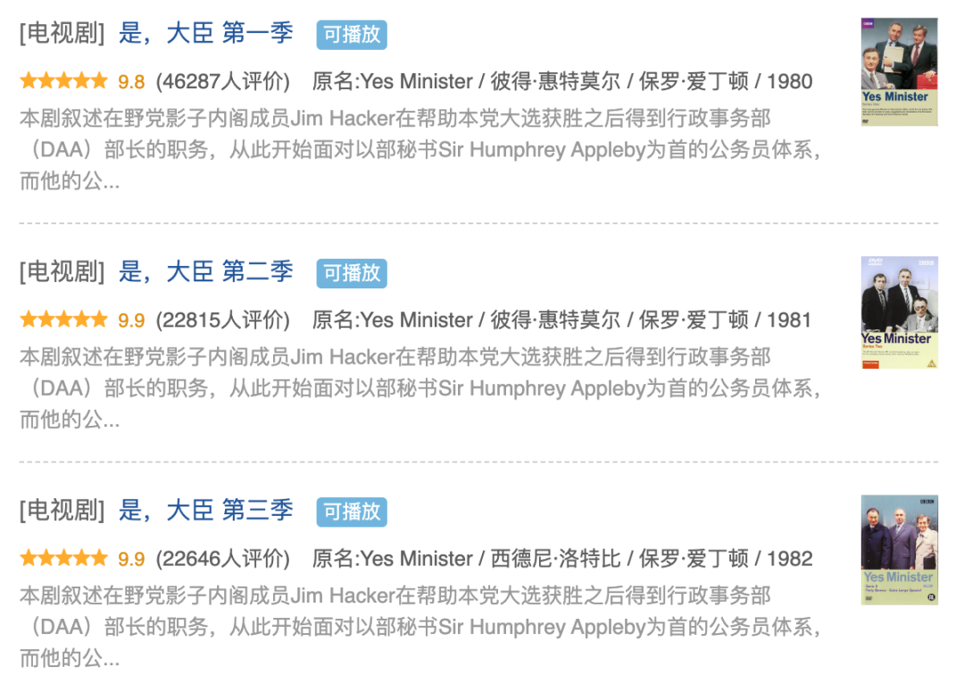 纵观豆瓣剧集历史榜单,9.9分神剧虽非个例,上世纪80年代的英剧《是,大臣》第一、二季就屹立不倒9.9分多年,但全球所有历史剧集算下来也仅此两部。《大明王朝1566》《老友记》《生活大爆炸》《白色巨塔》等中海外经典剧目在情怀因素的加持之下,皆未达到此高度。