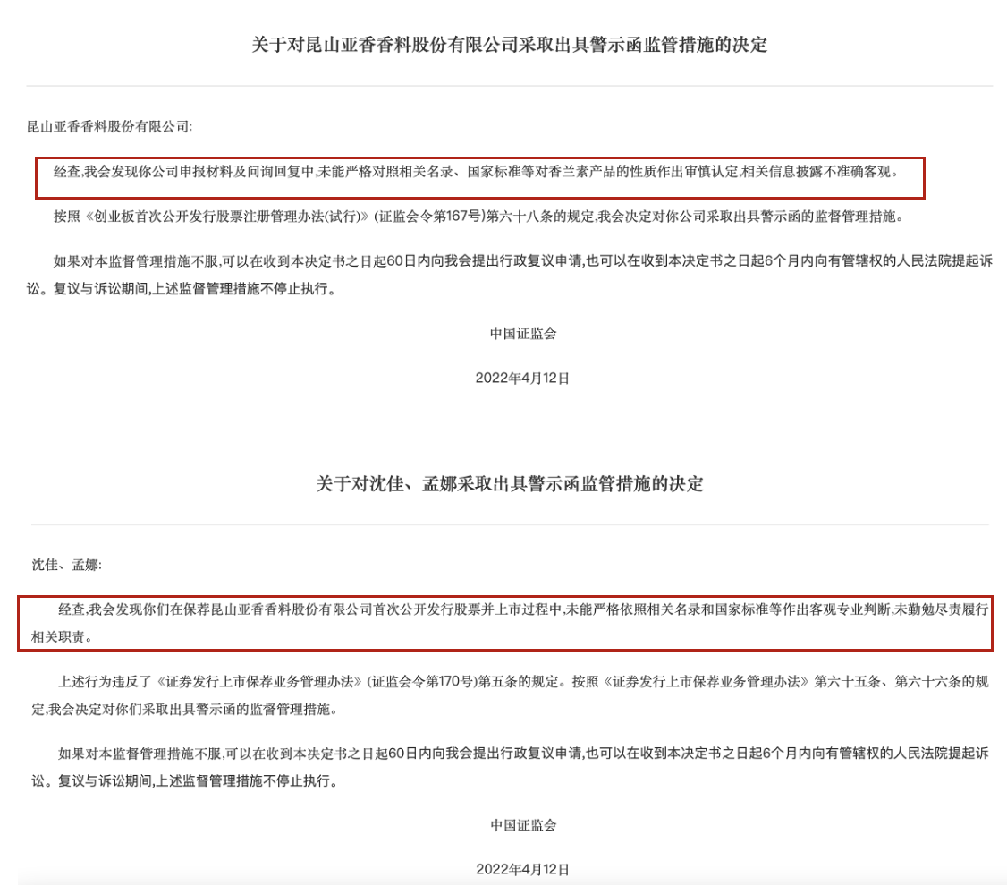 根据4月25日证监会官网信息,亚香股份未能严格对照相关名录、国家标准等对香兰素产品的性质作出审慎认定,相关信息披露不准确客观,公司被出具警示函;平安证券的沈佳、孟娜保荐亚香股份首次公开发行股票并上市过程中,未能严格依照相关名录和国家标准等作出客观专业判断,未勤勉尽责履行相关职责,2名保代同样被出具警示函。
