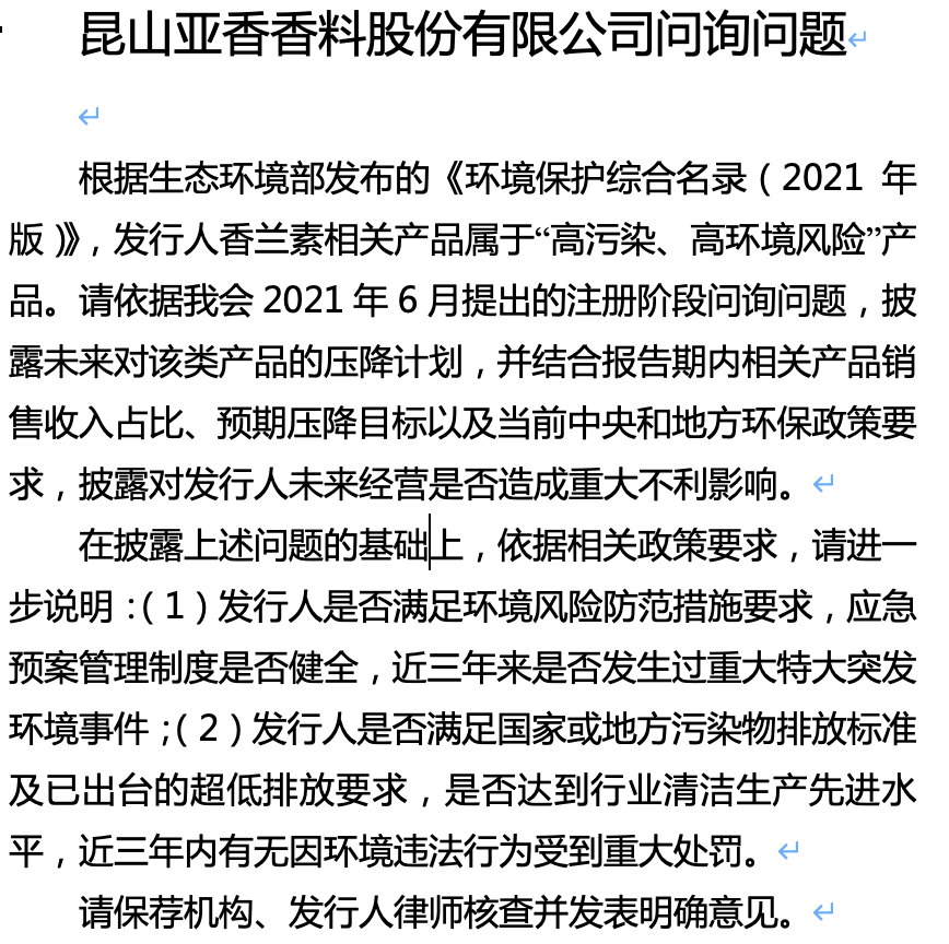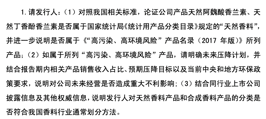 但界面新闻记者注意到,尽管今年3月24日监管层发出的第3次注册阶段问询问题还未回复,亚香股份在最新一版于今年3月31日更新的注册稿中修改了说辞,“根据国家生态环境部发布的《高污染、高环境风险”产品名录(2021年版)》,公司主要产品丁香酚香兰素、阿魏酸香兰素所属类别“香兰素(产品代码2625030300)”,被列为“高污染、高环境风险产品”。”