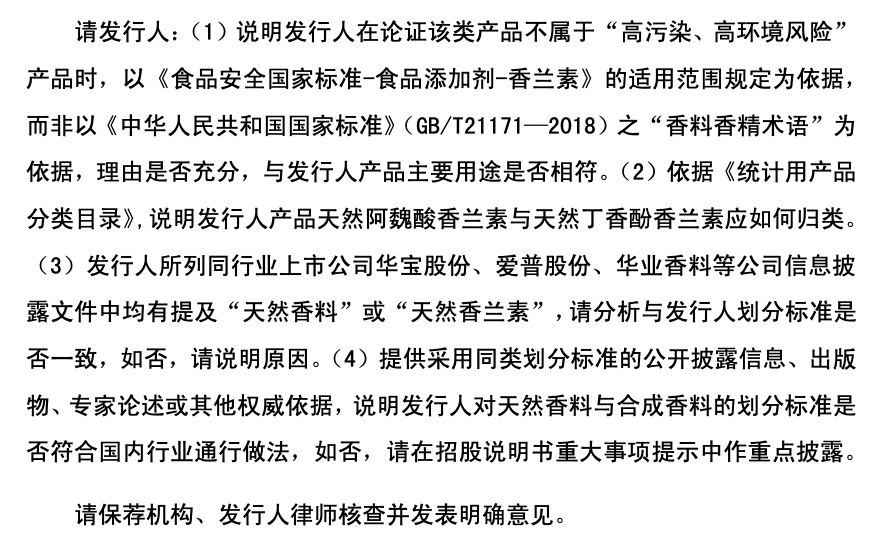 根据2021年7月29日亚香股份注册阶段第一次问询回复显示,公司天然阿魏酸香兰素和天然丁香酚香兰素不属于《统计用产品分类目录》规定的天然香料”,也“并非《统计用产品分类目录》中被归类为合成香料的香兰素”;同时认为其产品天然丁香酚香兰素、天然阿魏酸香兰素与适用《食品安全国家标准-食品添加剂-香兰素》所列的香兰素系不同种产品,故不属于《“高污染、高环境风险”产品名录(2017年版)》所列“香兰素”产品;并且基于境外客户的通常做法、产品介绍等理由,以美国法规定义为标准划分天然香料和合成香料。