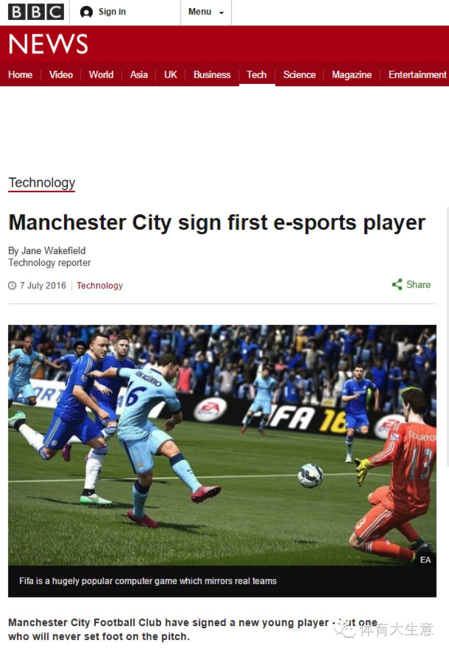 ▼BBC在报道足球俱乐部签约电子竞技运动员的消息导语中说:“曼城签了一位新人,但他永远不会上场。”