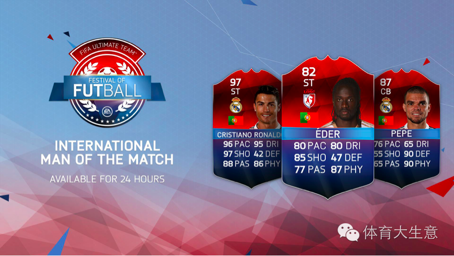 当葡萄牙欢呼2016年欧洲杯胜利后,知名足球游戏《FIFA 16》也迅速更新游戏,在“终极球队模式”(Ultimate Team,简称“UT”)中推出红色国际赛最佳球员卡。绝杀的埃德尔,防守擎天柱佩佩以及虽然受伤提前下场、但毕竟是球队领袖的C罗都成为特殊卡包的主角,拥有特殊的高能力值。