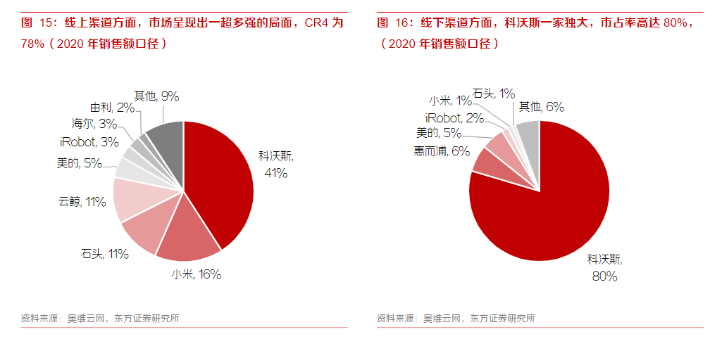 而在安克创新的另一王牌产品扫地机器人上,竞争压力更大。2020年数据,线上渠道方面,科沃斯独占41%的市场份额,小米、石头、云鲸、美的等紧随其后;在线下,科沃斯依然遥遥领先,占据80%的市场,惠而浦、美的、iRobot也名利前茅。