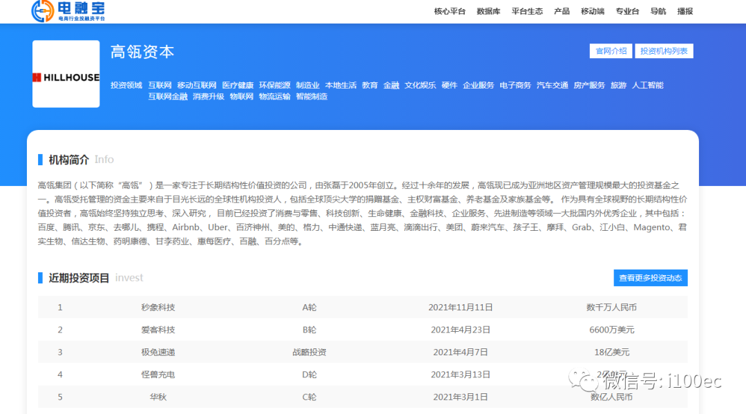 据网经社“电融宝”投资方库显示,高瓴资本创立于2005年,是一家专注于长期结构性价值投资的公司,经过十余年的发展,高瓴现已成为亚洲地区资产管理规模最大的投资基金之一。
