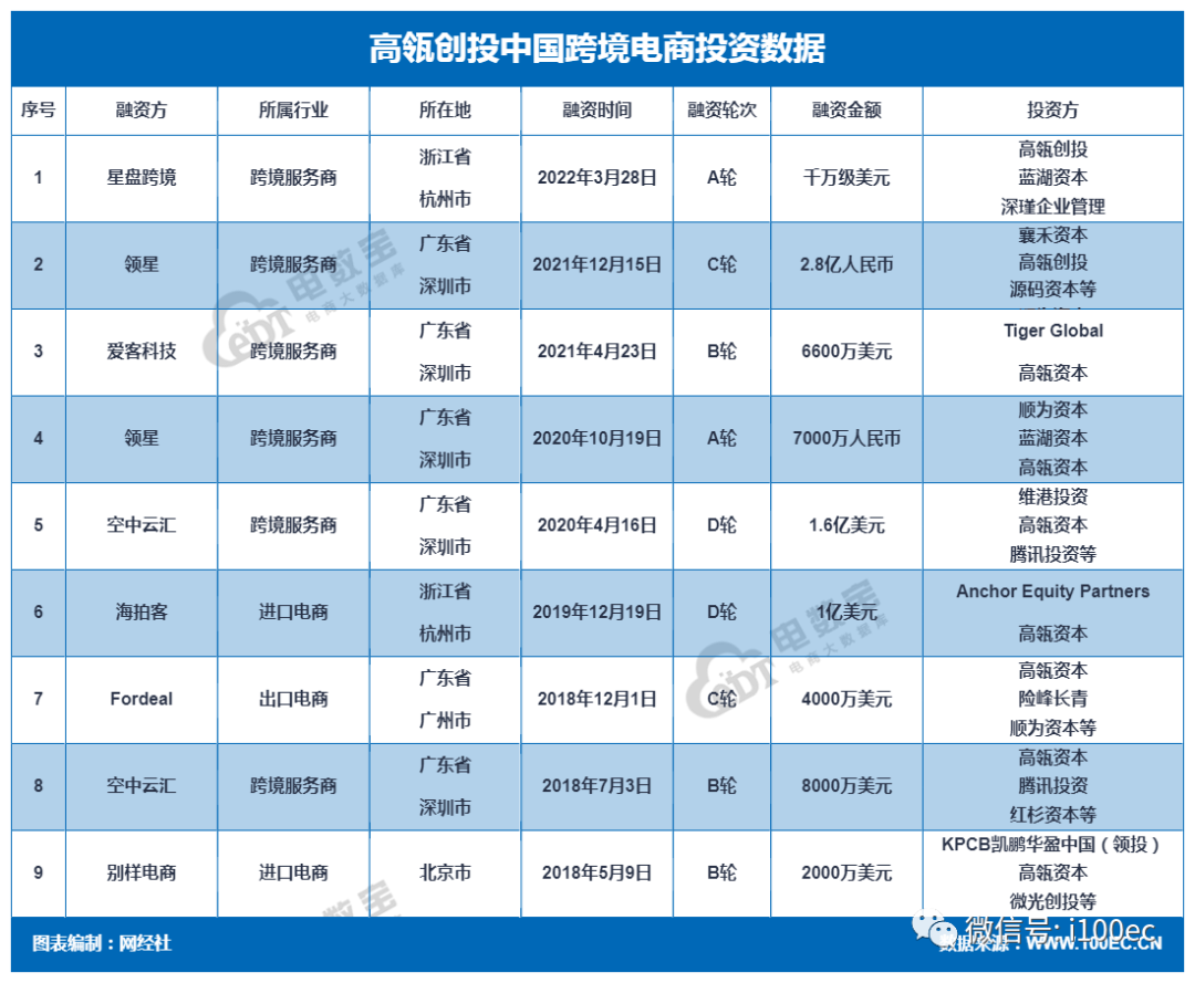 据网经社“电数宝”(DATA.100EC.CN)电商大数据库监测数据显示,2018年5月9日至2022年3月28日,高瓴创投累计参与了9起跨境电商领域的投资,涉及公司分别为:星盘跨境、领星、爱客科技、领星、空中云汇、海拍客、Fordeal、空中云汇、别样电商等。
