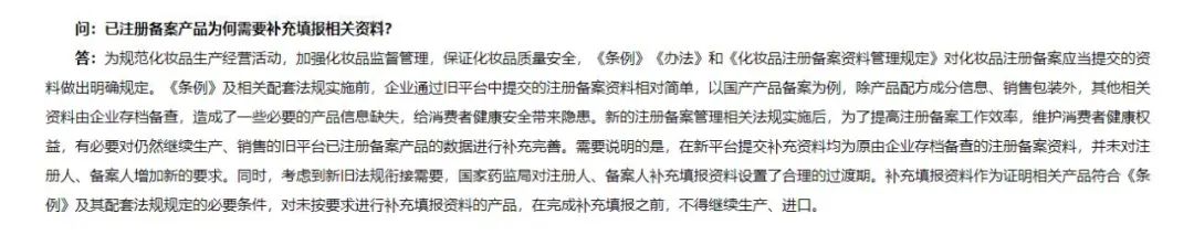 4月8日,国家药监局化妆品监管司在化妆品监督管理常见问题解答(四)(下称解答)中再次表示,未按要求进行补充填报资料的产品,在完成补充填报之前,不得继续生产、进口。