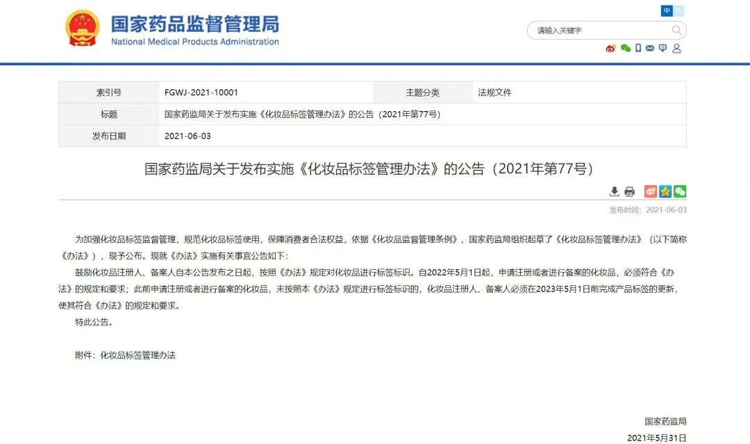 5月,《化妆品标签管理办法》(下称《办法》)也将正式施行,对标签的要求做了更进一步的释义和规范。按照要求,自2022年5月1日起,申请注册备案的化妆品,必须符合《办法》的规定和要求。此前申请注册备案的化妆品,未按照本《办法》规定进行标签标识的,应在2023年5月1日前完成产品标签的更新。
