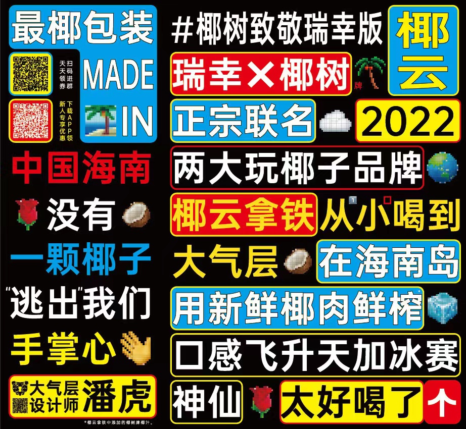 在创新力之外,瑞幸对先锋、实验性的产品非常包容,接纳度很高。潘虎表示,联名包装风格是椰树的,但整体的组合形式包括加入了像素化的图标,类似弹幕或者对话框这样的一些元素,另外还有字的间距重新调整,更有设计感。