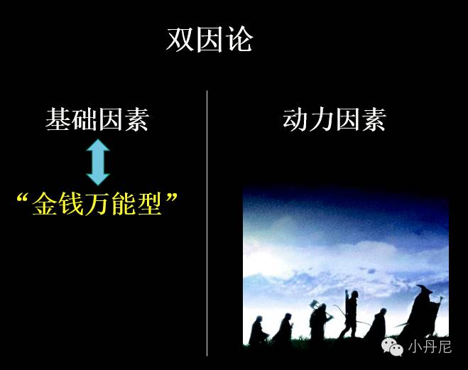 小结“金钱万能型”人关注的是“基础因素”,“事业理想型”人关注的是“动力因素”。