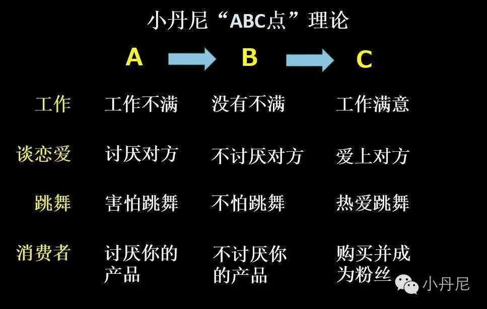 请记住“ABC理论”的核心是永远关注“动态持续性”过程,所以营销也不可能直接让消费者从“不想买你的产品”直接转变为“购买并成为你的粉丝”。俗话说是“不能一口吃成一个胖子。”