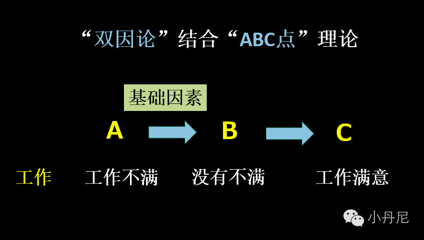 如果工作的“基础因素”得到了改善,你不会立刻爱上这份工作,最多是不再讨厌它罢了,所以,“基础因素”可以实现"ABC点"理论的从A点到B点:
