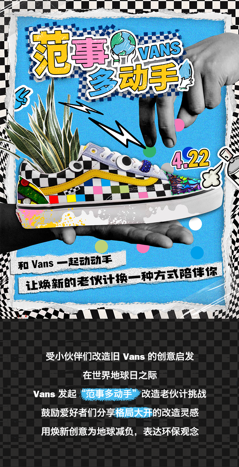 同时,Vans也推出了「世界地球日环保」系列鞋服,用产品向更多人传递保护环境的观念,唤醒人们关注无可替代的地球。另外,Vans在线上发起「范事多动手」改造老伙计挑战,参与者可对闲置Vans进行改造。