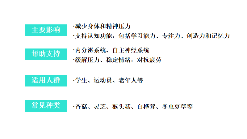 免疫支持是蘑菇成分最核心的作用之一。自20世纪中叶以来的各项研究显示,绝大多数蘑菇,包括地衣型蘑菇中所包含的多糖类物质能对人体免疫功能进行双向调节。此外,蘑菇当中还具有萜类、酶类以及不饱和脂肪酸等类活性物质,能促进激发人体免疫细胞活性。·认知健康目前,认知健康是蘑菇成分应用较多的方向,当中主要使用的原料是猴头菇。猴头菇所含有的猴头菌素可促进神经生长因子(NFG)合成活性,帮助修复受损的神经元,并维持大脑神经稳态,有效优化大脑神经系统,从而增强认知功能。·情绪管理蘑菇作为一类适应原原料,能促进增强身体对生物、化学及生理性紧张性刺激的应对能力。生活中较为常见的适应原蘑菇成分是灵芝和冬虫夏草,这两种蘑菇中的活性成分可以有效增加人体的能量和耐力,提高人体免疫力,并帮助减轻压力和疲劳。·丰富维矿蘑菇中除富含蛋白质与膳食纤维外,还包含大量的维生素D、B族维生素,钙、铁、钾、铜等维生素矿物质成分。随着蘑菇的多种潜在功能被大量研究所证实,如今它不再仅仅作为餐桌上烹调的食物,科学家们开始大开脑洞,渴望从它身上发掘出更多奇妙的可能性。同时许多制造商也对它抱以浓厚的兴趣,试图在它身上找寻更多商业价值。