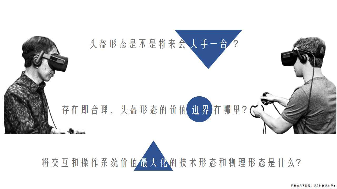 对于第一个问题,答案是不会。因为从人手一台这个层面来说,你没有必要随身携带一个让你随时被蒙着眼的产品;第二个问题,头盔形态肯定有它的价值,但它的价值,肯定是特定场景的使用为主,也就是头盔可以被归入家庭影音娱乐系统或者某些TO B的场景应用,但是要注意,在TO B的场景应用中,蒙着眼也是比较危险的;第三个,VR引导人类沉浸虚拟现实的方向肯定无法将交互和操作系统最大化,因为VR无法将交互需求和操作系统所谓的计算平台概念提升到普世化工具的层面,与真实性隔离这点,注定了它的未来。