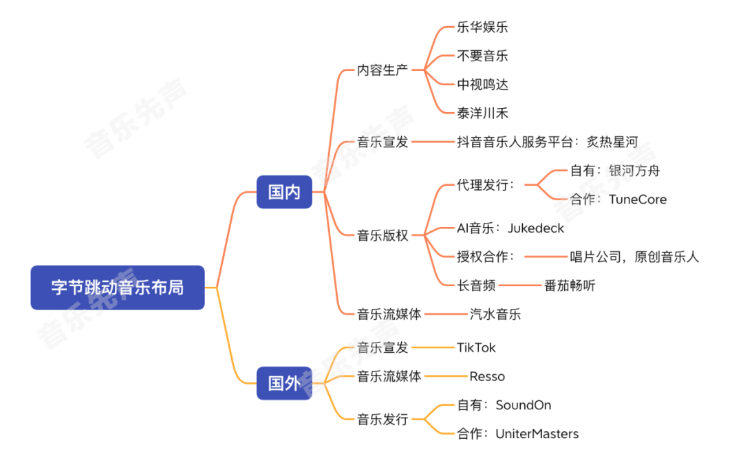 与此同时,字节跳动在音乐产业的布局上,也从内容、渠道等方面探索着自己的新路子。 一方面,字节跳动通过投资和自身业务升级来形成一条从内容生产、音乐宣发到版权代理发行、流媒体的全产业链。例如,字节跳动就是通过投资乐华娱乐、不要音乐等内容公司,夯实供给端。另一方面,从横扫全球的短视频平台TikTok、海外音乐流媒体服务Resso、发行平台SoundOn到本土市场的抖音、汽水音乐,字节跳动在国内、国外两条线的发力也为后续发展继续着能量。