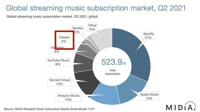 2019年,Deezer称自己拥有1600万月活用户。而据Midia Research数据显示,截至去年6月底,Deezer在全球所有音乐流媒体付费用户中的份额为2%,倒推其付费用户大约有1050 万订阅者。 在全球视野内,Deezer虽然实力远远不敌位列第一名的Spotify,但它是一个颇具“区位优势”的平台,例如在法国和巴西它分别拥有29%和17%的市场份额。