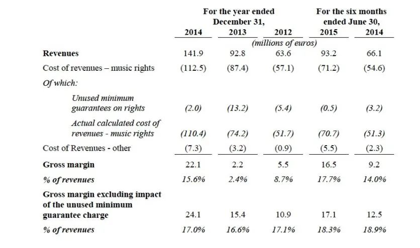 同时,Deezer却要负担高昂的版权成本。在上市前发布的财报中显示,从2012年到2015年间,Deezer为唱片公司支付高达2.87亿美元的版权预付款,而付费订阅和广告的收入仅为2.64亿美元,两者之间的赤字2300万美元。再加上Deezer的运营成本,上市前Deezer的净亏损高达9950万美元,这对潜在投资者而言并不是一个好的信号。