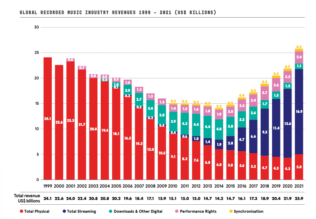 七年前,Deezer急流勇退的原因是堪忧的市场状况;七年后,Deezer卷土重来也是因为市场状况大不相同。 根据IFPI的数据,2015年全球录制音乐产业创造了147亿美元的收入,其中仅有28亿美元来自流媒体,占比为19%,下载和其他数字音乐的收入为38亿美元,占比35.8%。而2021年,全球录制音乐产业创造了259亿美元的收入,其中有169亿来自流媒体,占比高达65%,而下载和其他数字音乐产业的收入为11亿美元,占比为4%。
