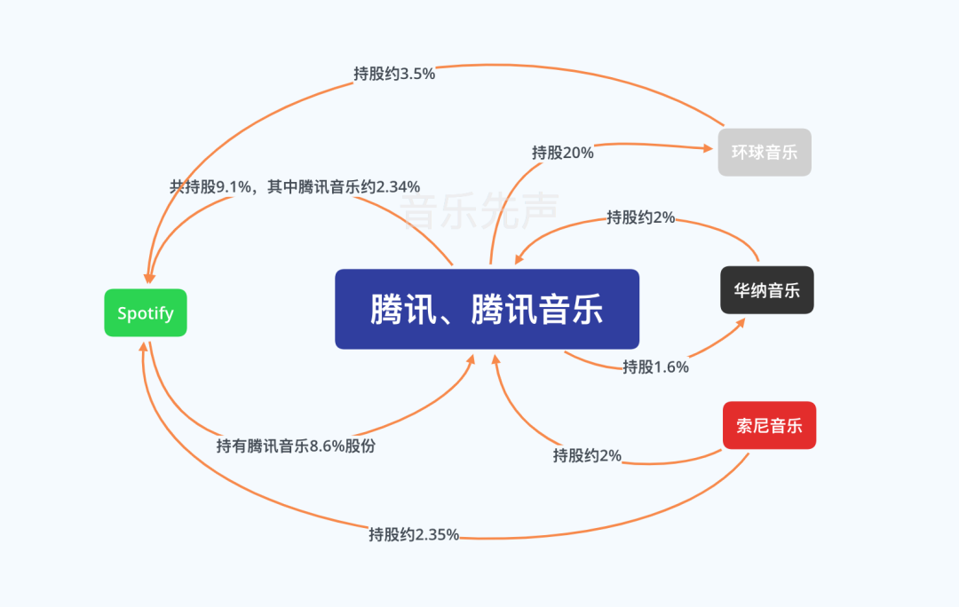 除了Deezer,细看其他唱片公司与音乐流媒体平台之间的股权关系,也是盘根错节。 在国内,腾讯音乐的投资版图更是覆盖到了环球、索尼、华纳的三大唱片,建立了自己的竞争壁垒。据音乐先声了解,腾讯和腾讯音乐曾先后斥资70亿购入例如环球音乐共计20%的股份,并在华纳音乐集团IPO前夕,花费2亿美元购进了华纳音乐全部股份的1.6%。同时,华纳音乐和索尼音乐娱乐也各持腾讯音乐的2%的股份。