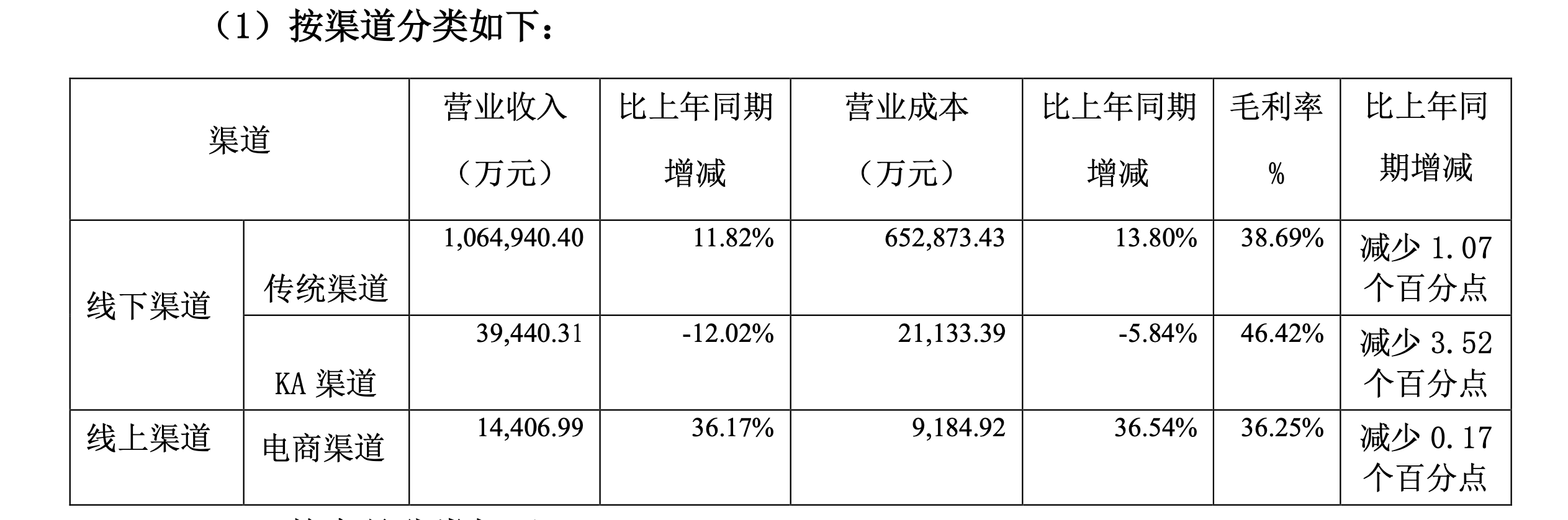 从销售渠道层面来看,线下渠道仍是燕京啤酒主要销售渠道。根据公告显示,传统渠道、KA渠道分别实现营业收入106.49亿元、3.94亿元,同比提升11.82%、-12.02%;毛利率分别为38.69%、46.42%,同比减少1.07个百分点、减少3.52个百分点。另外,线上电商渠道实现营收1.44亿元,同比提升36.17%,毛利率为36.25%,同比减少0.17个百分点。