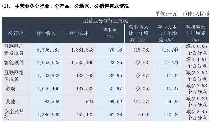 从各个业务来看,三六零旗下主要业务收入出现不同下滑。其中,互联网广告及服务收入同比下降16.06%,智能硬件收入同比下降3.68%,互联网增值收入同比下降2.67%,游戏收入同比下降2.05%。值得注意的是,其安全及其他业务表现突出,收入增速达到70.91%。