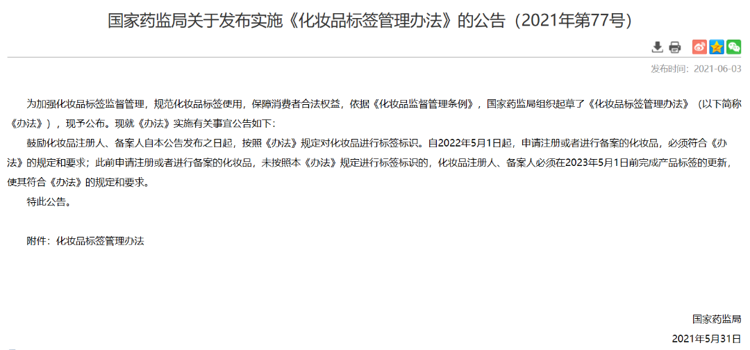 2021年公告发布后,留有一年时间让企业进行过渡、整改,2022年5月1日后,申请注册或者进行备案的化妆品,必须符合办法的规定和要求;此前申请注册或者进行备案的化妆品,未按照本办法规定进行标签标识的,化妆品注册人、备案人必须在2023年5月1日前完成产品标签的更新,使其符合办法的规定和要求。