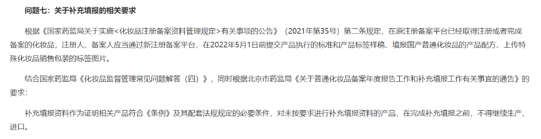 过渡期限将至,那么如果在5月1日前没有完成产品资料补录和补充功效摘要的产品,会面临怎样的结果?4月8日,国家药监局发布化妆品监督管理常见问题解答(四) ,其中提到:对未按要求进行补充填报资料的产品,在完成补充填报之前,不得继续生产、进口。