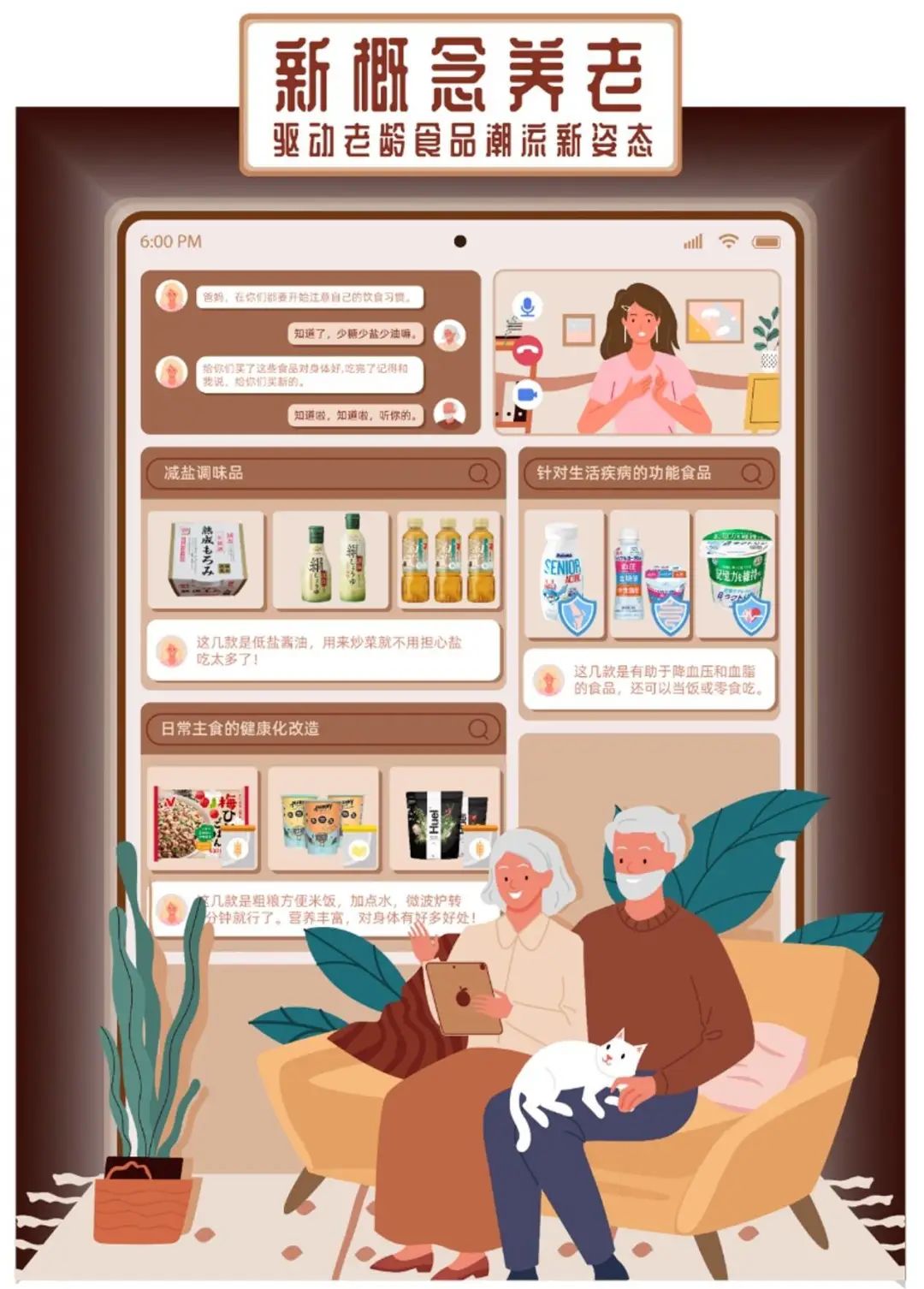 Foodaily发布的2022年度十大商业热点中,对于老年食品的市场机遇做出2点判断:一, 伴随更多中产阶层步入老年群体,数字化兴起,银发族整体消费能力与审美能力大幅增强,更加追求时尚和体验感;对适老型产品的形态、功能、场景和包装要求有了质的提升。二,年轻人的新理念、新认知和新态度,为传统老年食品市场注入新鲜活力。来自青年的反哺,已经成为当代养老模式中不可忽视的因素,也是推动老年食品创新的新力量。