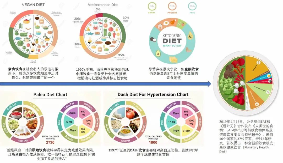 从1990年代开始,各种膳食模式就通过媒体开始影响全球。比如通过社会名流代言而在各国掀起巨大声量的素食饮食;在运动健身人群中风行的生酮饮食;针对高血压防控、连续8年蝉联全球健康饮食首位的DASH饮食,以及以橄榄油与红酒为标志性食物,主张清淡与简单加工,富含单不饱和脂肪酸和膳食纤维的地中海饮食等。