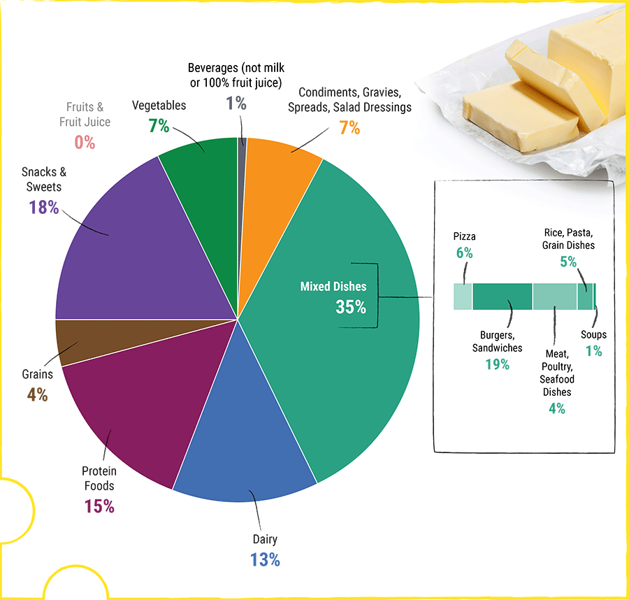 2016年3月,美国心脏病学院发表了一篇针对2015版膳食指南的解读文章,文中提到美国居民主流饮食中饱和脂肪的来源构成。从上图中可见:披萨、汉堡、三明治和肉类食物是饱和脂肪的最大“贡献者”,占比达到35%。