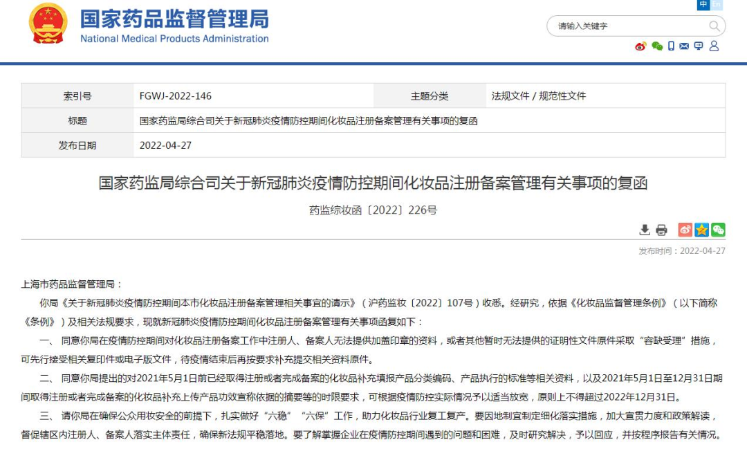 国家药监局在“关于新冠肺炎疫情防控期间化妆品注册备案管理有关事项的复函(下称复函一)”中表示,“同意上海药监局提出的对2021年5月1日前已经取得注册或者完成备案的化妆品补充填报产品分类编码、产品执行的标准等相关资料,以及2021年5月1日至12月31日期间取得注册或者完成备案的化妆品补充上传产品功效宣称依据的摘要等的时限要求,可根据疫情防控实际情况予以适当放宽,原则上不得超过2022年12月31日”。