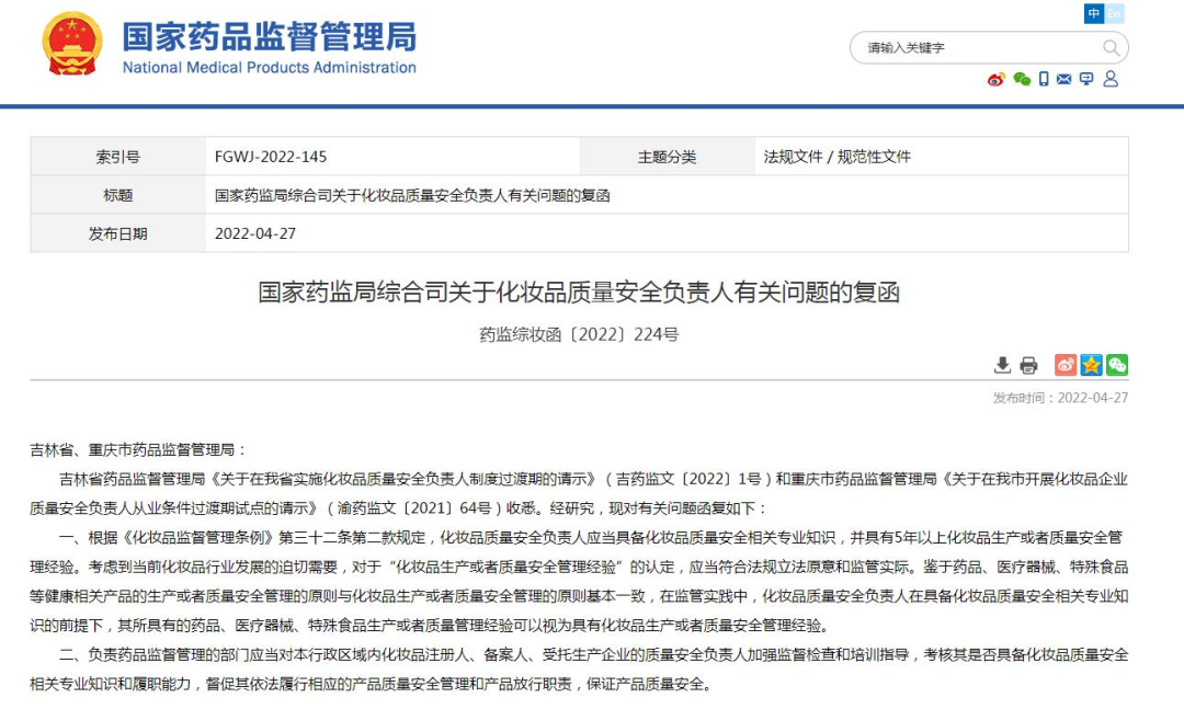国家药监局在回复吉林省药监局和重庆市药监局“关于化妆品质量安全负责人有关问题的复函(下称复函二)”中明确表示,对于“化妆品生产或者质量安全管理经验”的认定,应当符合法规立法原意和监管实际。“鉴于药品、医疗器械、特殊食品等健康相关产品的生产或者质量安全管理的原则与化妆品生产或者质量安全管理的原则基本一致。因此。在监管实践中,化妆品质量安全负责人在具备化妆品质量安全相关专业知识的前提下,其所具有的药品、医疗器械、特殊食品生产或者质量管理经验可以视为具有化妆品生产或者质量安全管理经验。”