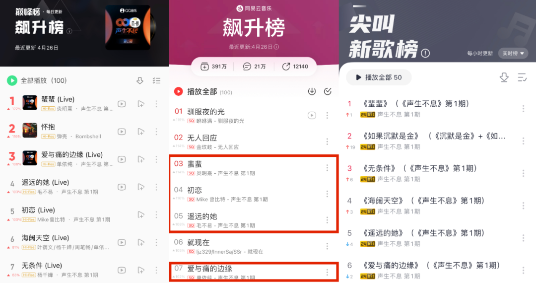 你只要翻开近期主流音乐平台的各家「新歌榜」,该音综的多首热曲几造屠榜之势。QQ音乐飙升榜的前7,咪咕音乐尖叫新歌榜的前6,网易云音乐飙升榜前7里的4首,都被《声生不息》音源包揽,多榜登顶的《蜚蜚》表现最出圈。
