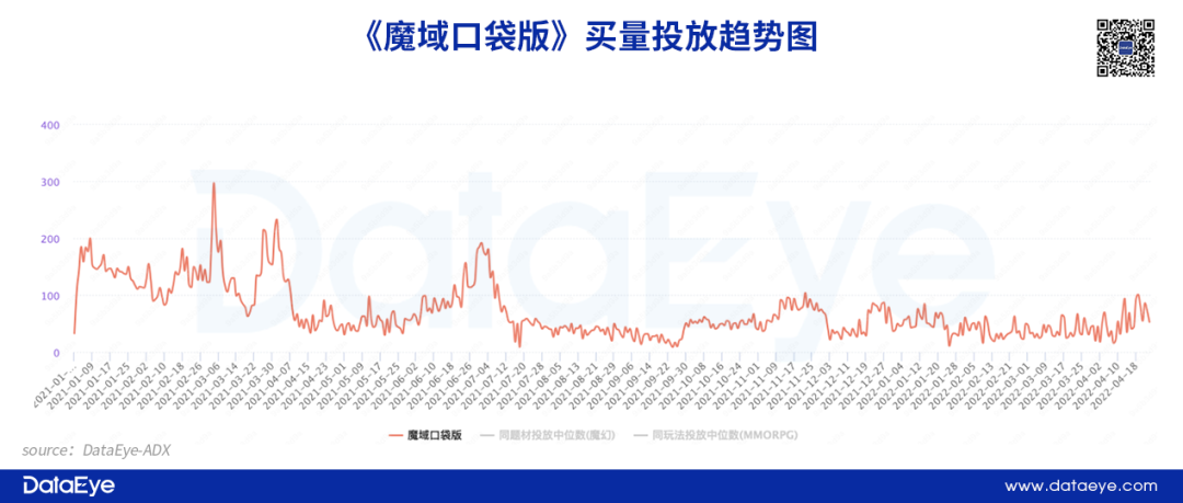 《魔域口袋版》在去年7月1日起,就降低了在买量市场的投放,单日投放量维持在百组素材的量级;