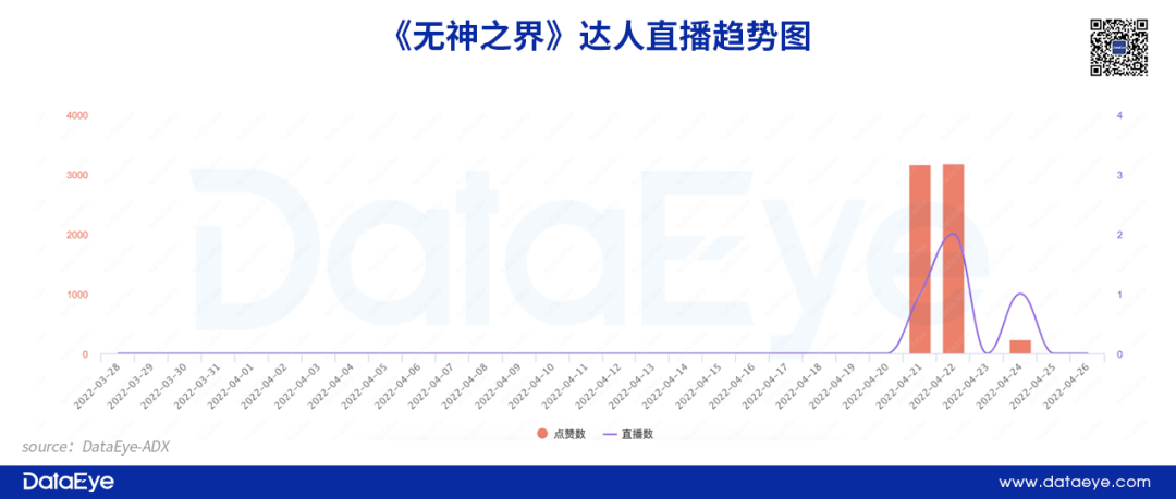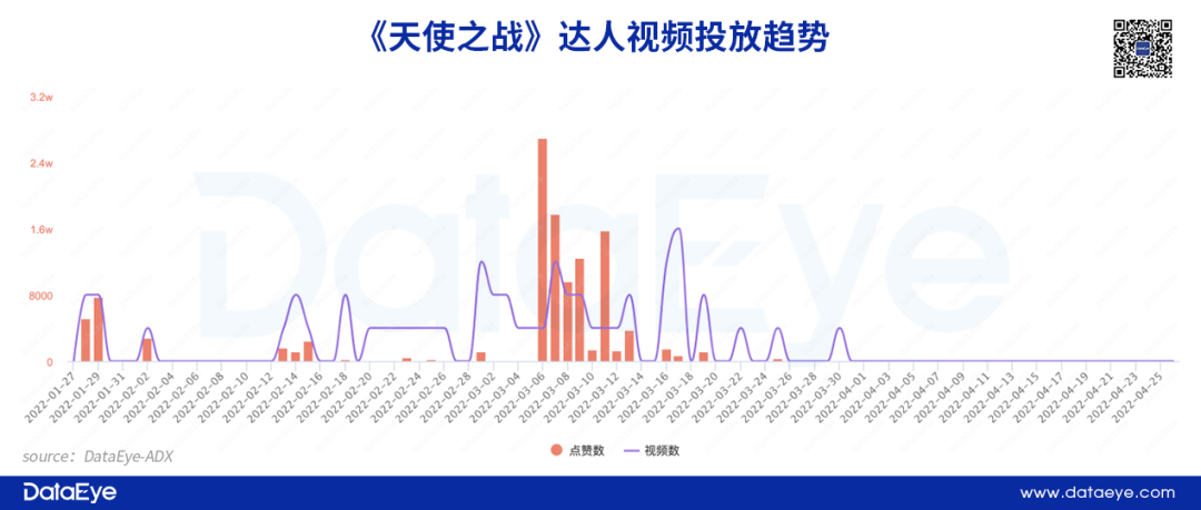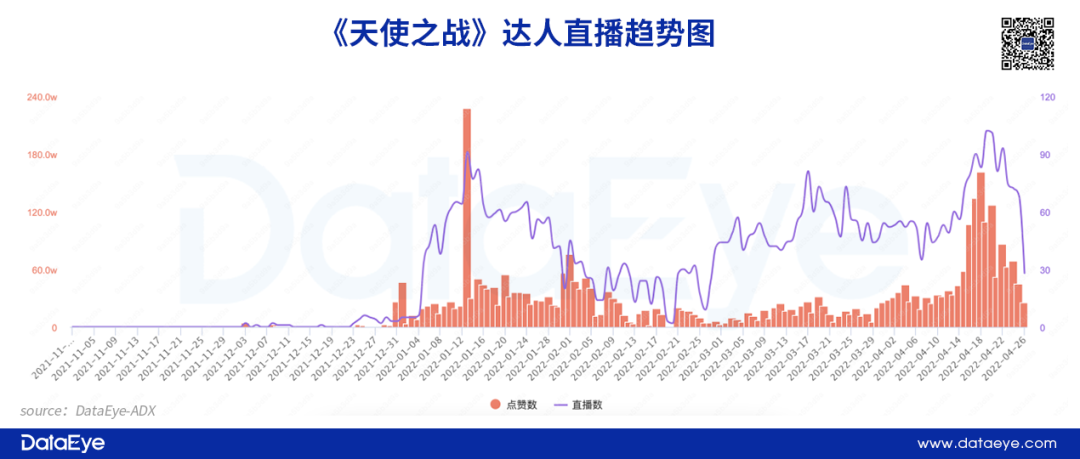 从《天使之战》达人直播投放的趋势图来看,其直播场数与点赞数明显不成正比。这其中有两重原因的存在:(1)《天使之战》并不契合达人直播的推广;(2)达人直播仍处于开荒阶段,《天使之战》未找到相应的营销方法论,仍需要不断的尝试、探索。