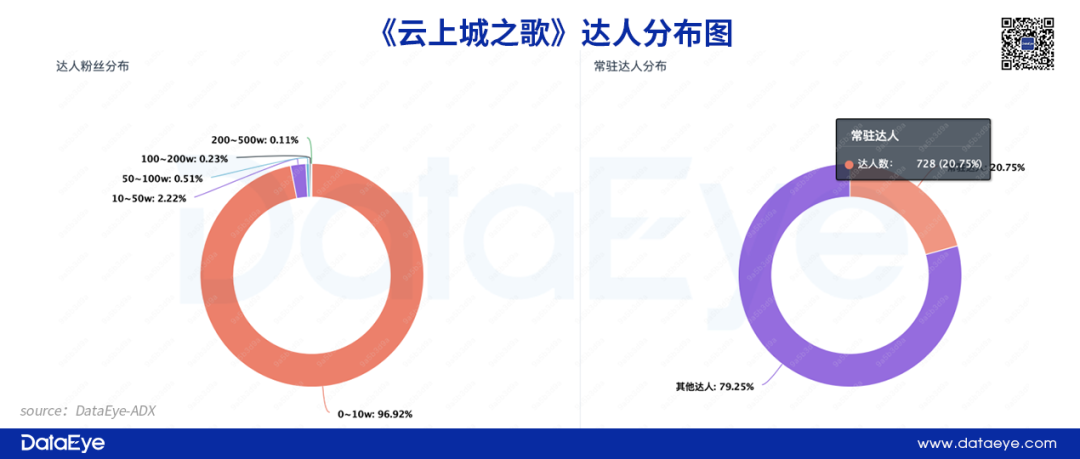《云上城之歌》在今年一季度邀请了3508名达人主播,其中3400名为0-10万粉丝数的主播,占比96.92%,常驻/签约达人数为728名,占比20.75%。