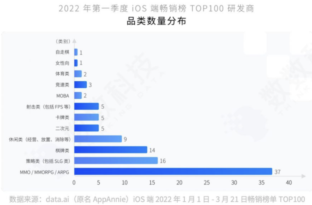Data.ai统计,2022年第一季度iOS畅销榜Top100产品中,有37款为MMORPG品类,与榜单第二的策略类游戏拉开一半以上的差距,可见MMORPG仍然是国内市场最卷的品类。