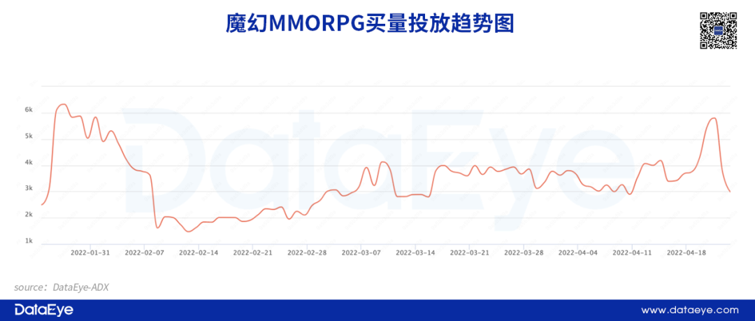 而聚焦到魔幻MMORPG这个分支,DataEye-ADX监测到,在买量市场,魔幻MMORPG自今年2月起,各大公司的投放量也在逐日攀升。DataEye研究院认为,这其中或许存有两大原因:1、春节期间争夺用户时长;2、得知《无神之界》、《黑色沙漠》即将上线,老产品们力求在新品冲击之前,加强对旗下产品的曝光度。