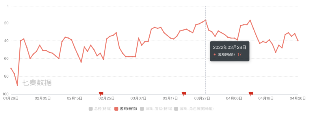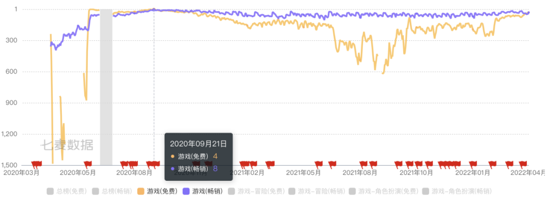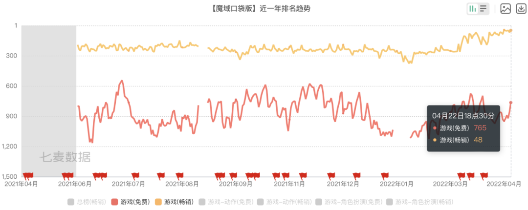 根据七麦数据统计可以发现,老产品们的买量效果显著,即将度过七岁生日的《魔域口袋版》最近两个月时间在iOS畅销榜从377名杀至48名;三七互娱旗下《云上城之歌》在2021年下半年遭遇低迷后,一路高歌猛进,在今年跻身iOS畅销榜前20名次,并在90天时间中,单iOS渠道就狂揽超6000万元的收入;而《天使之战》的首月流水也突破了1亿元。
