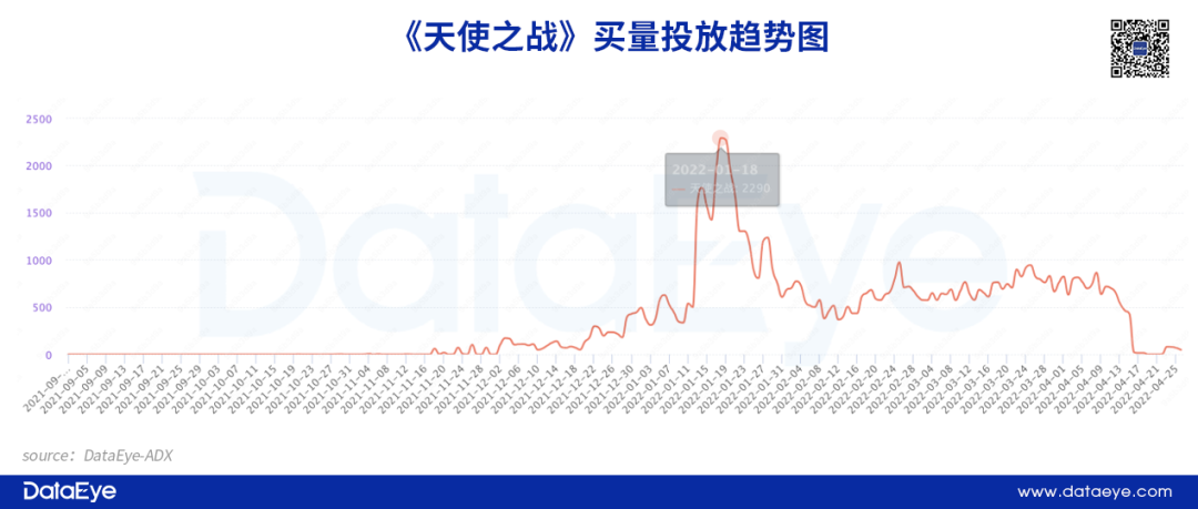 《天使之战》则是在上线初期呈现大范围的投放,在此之后就缩减买量;