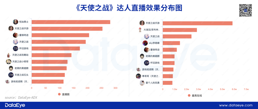 在左侧达人直播数TOP10表中,10名主播均为恺英网络旗下签约直播,而在右侧达人推广效果表中,TOP3都是《天使之战》专职主播。值得注意的是,《魔兽争霸》职业选手Sky的推广效果排到了第四,这说明《天使之战》用户与其粉丝有一定的重复度,能有效提高直播的转化率。