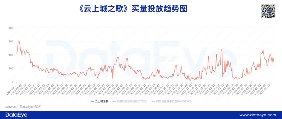 《云上城之歌》的买量投放起伏明显,在今年1月份加大投放量级后,2月投放量呈断崖式下滑,并在3月份再次加码;