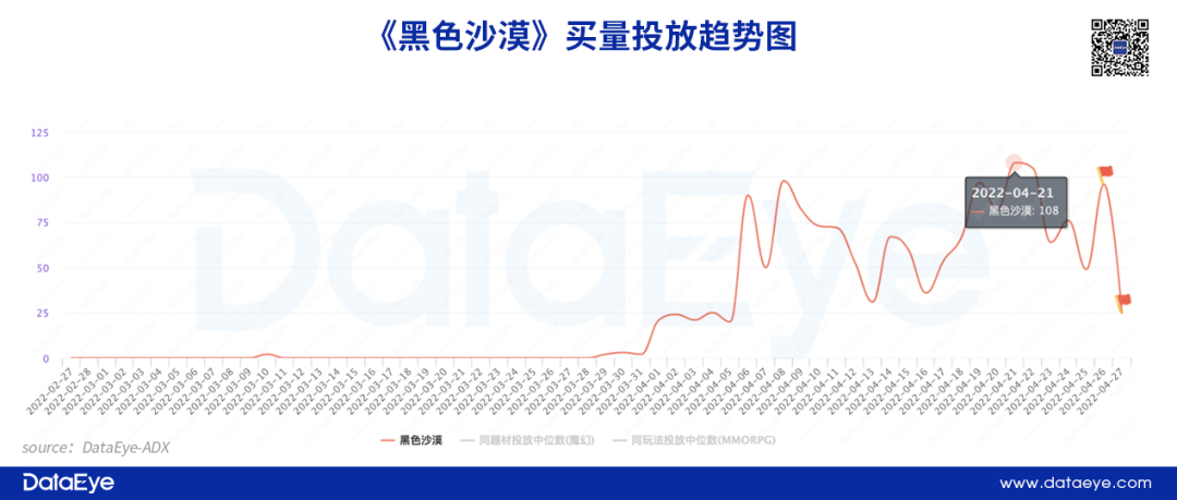《黑色沙漠》在买量端的投放并没有倾斜过多资源,近30天买量投放量维持在三位数左右;